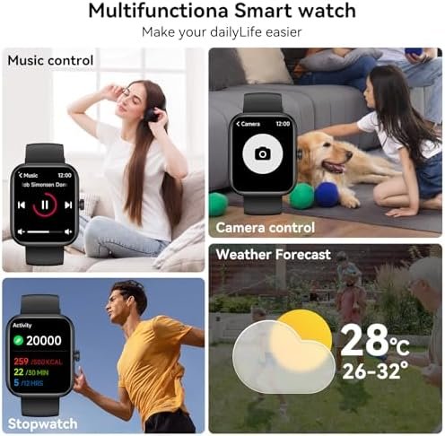 Multi Functionality: Smart watch for men women with alexa assistant, alarm clock, stopwatch, flashlight, water reminder, music control, camera control, weather forecast, find mobile phone and other useful functions